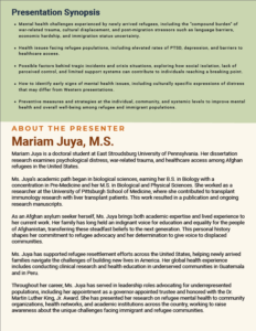 Ms. Juya further addressed broader contributing factors, including global displacement trends, the psychological impact of travel bans and violent events, barriers to healthcare access, and the importance of recognizing early warning signs of mental distress. She emphasized culturally responsive approaches and global healing traditions alongside prevention strategies that restore control, build connection, and reduce stigma.